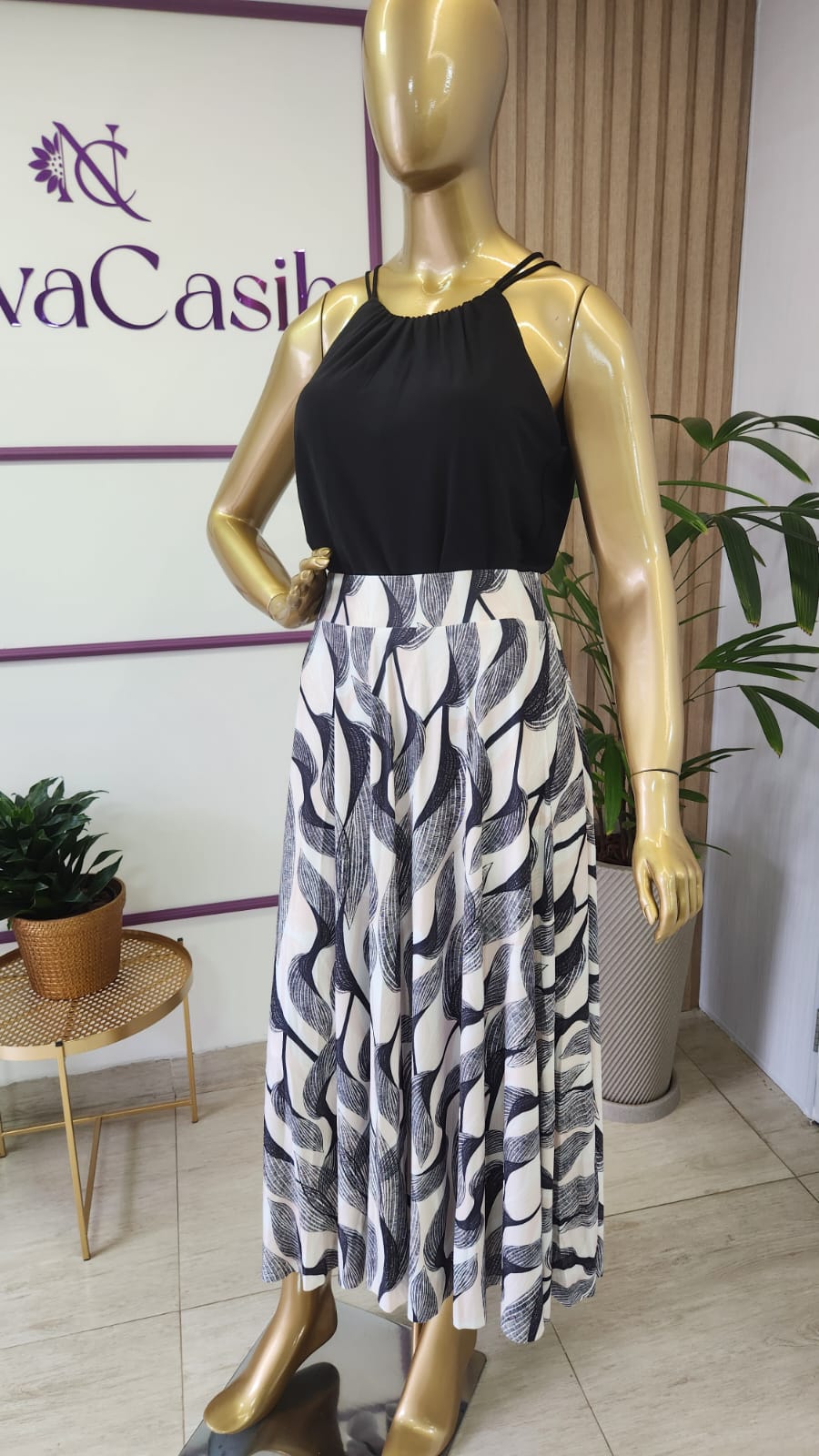 • Modelagem Godê Amplo: O corte em godê confere o visual de saia rodada ampla, garantindo um caimento impecável. O movimento da peça ao caminhar é suave, leve e gracioso, valorizando diferentes tipos de corpo.