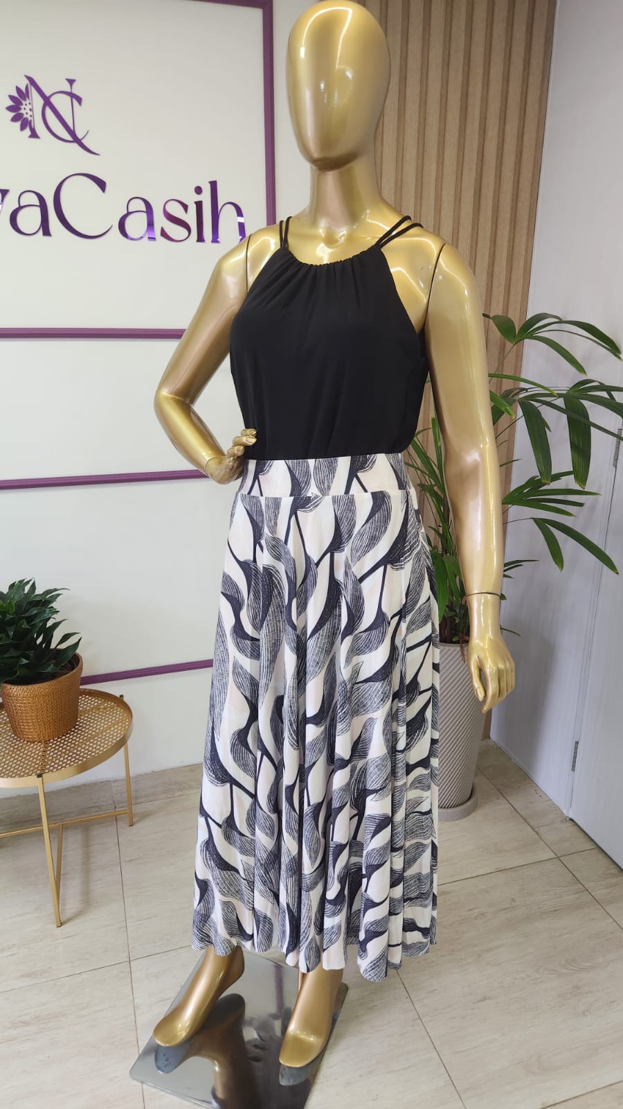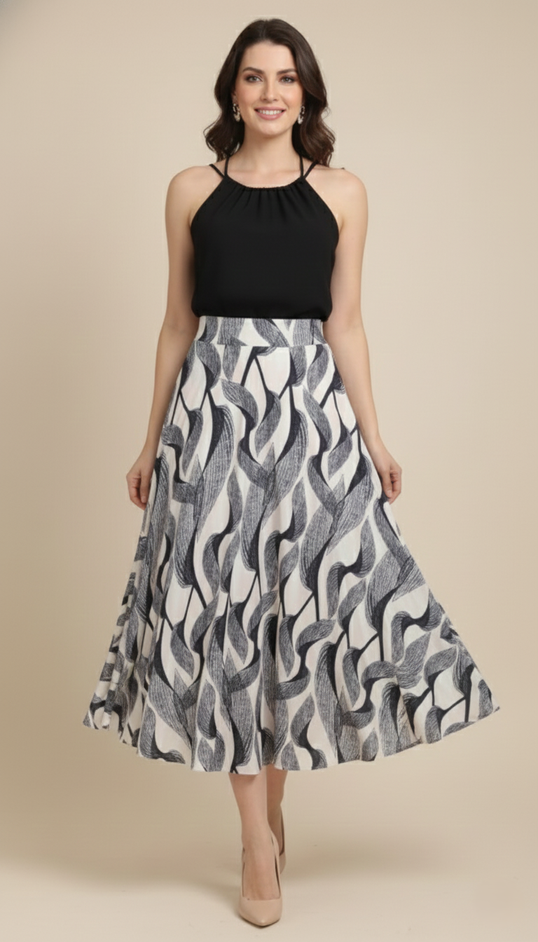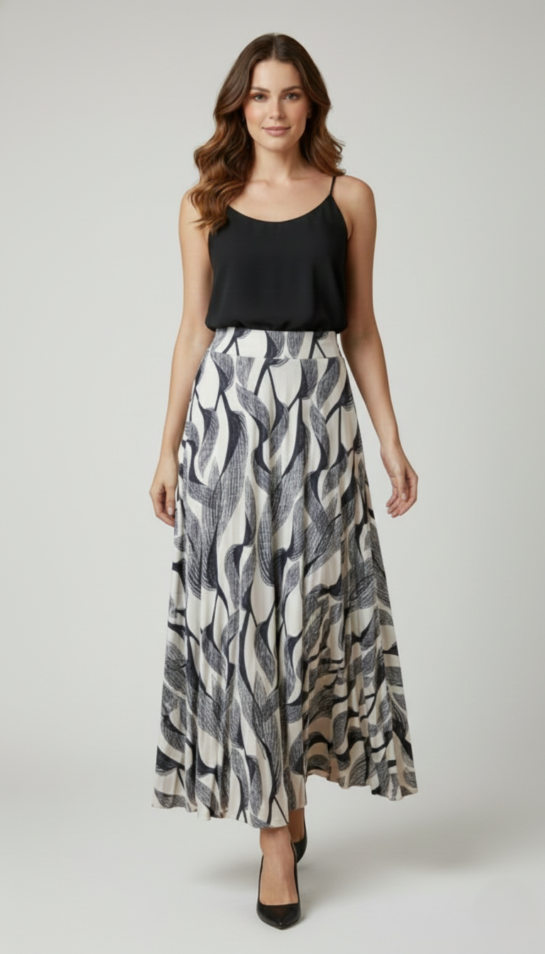 • Sugestões de Combinações: Use com regatas e blusas lisas em tons neutros (preto, branco, off-white ou cinza) para manter o foco na estampa. Combine com sandálias de salto fino, sapatilhas ou mules, e acessórios em prata ou ouro branco.