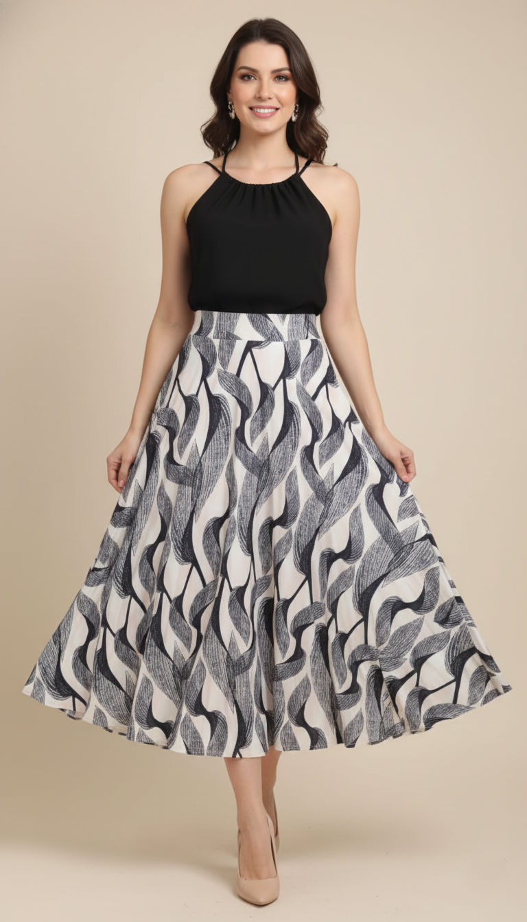 Saia Midi Elen Rodada Feminina em Malha Fluity Premium – Estampa Abstrata Exclusiva