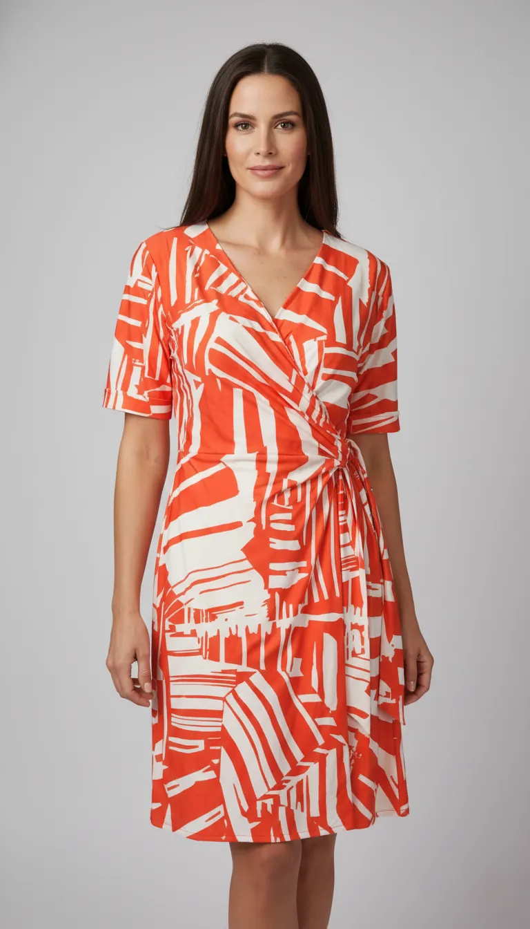 Estampa Exclusiva: A peça é realçada por uma estampa exclusiva, de contraste marcante em laranja vibrante e branco. O padrão gráfico abstrato garante um visual dinâmico, alegre e altamente sofisticado.