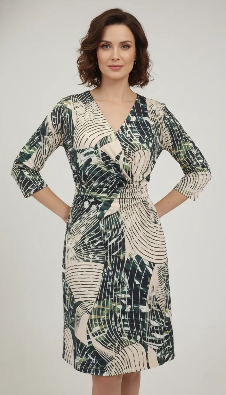 Estampa Exclusiva: A peça é adornada por uma estampa exclusiva que harmoniza elementos tropicais (folhagens) com traços gráficos modernos, em uma paleta de cores elegantes que mescla tons profundos de verde-esmeralda/militar e bege claro (off-white).