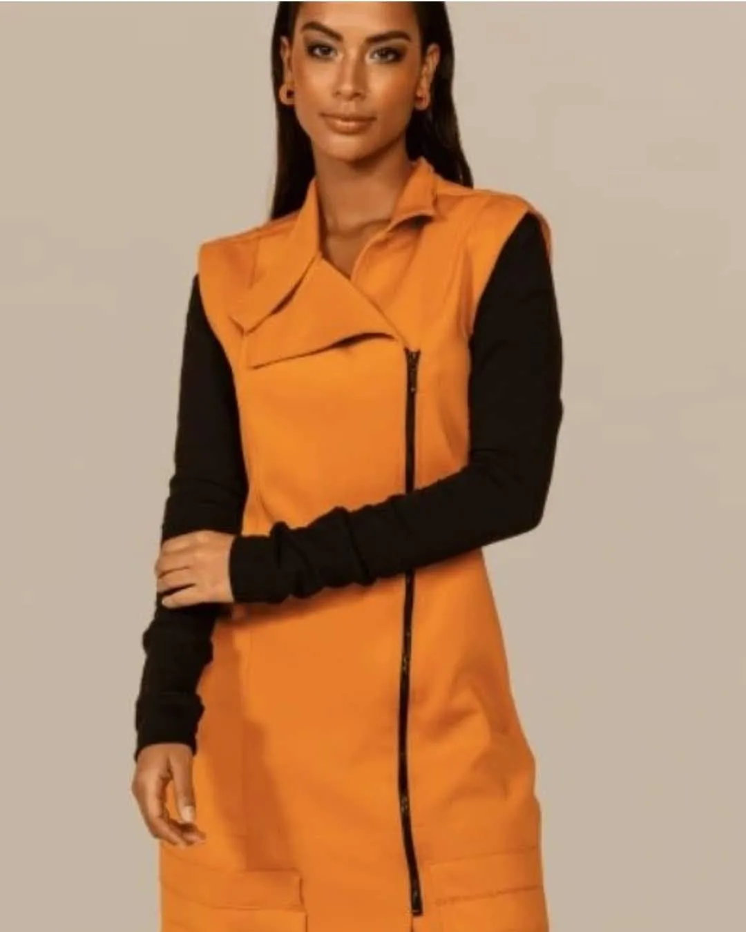 Design Assimétrico: O fechamento frontal em zíper tratorado deslocado traz um ar urbano e moderno, permitindo ajustar a profundidade do decote conforme a ocasião.