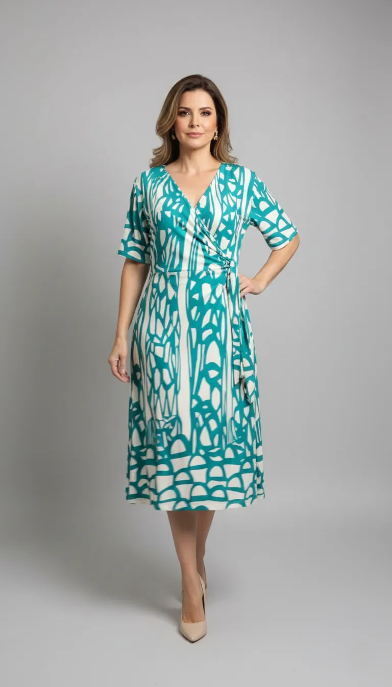 Vestido Curto Cachecoeur da NovaCasih, uma peça que combina a elegância clássica do decote transpassado com uma estampa vibrante e fresca. É o item ideal para quem busca estilo, conforto e um caimento perfeito.