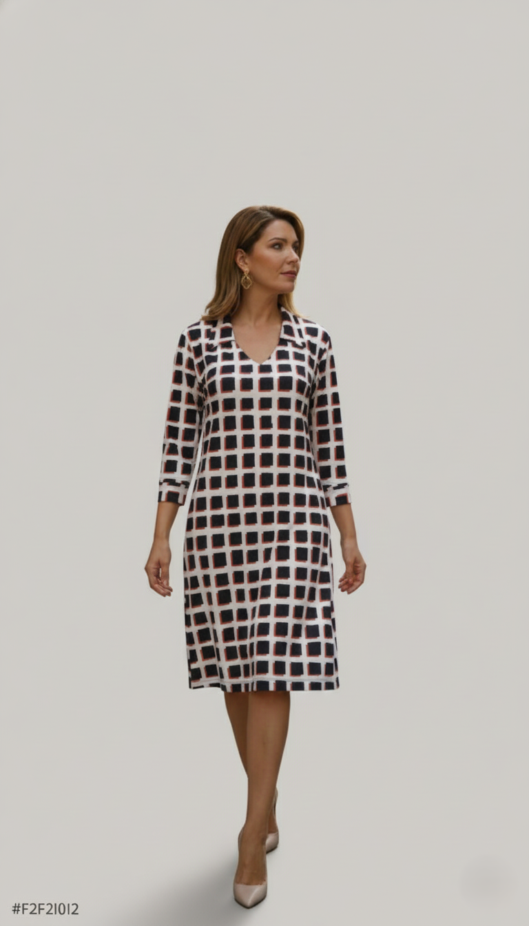 A gola de camisa adiciona um toque refinado e contemporâneo, enquanto as mangas 3/4 trazem charme e versatilidade, tornando a peça ideal para diferentes ocasiões, do trabalho a encontros casuais. Sua estampa exclusiva confere personalidade e estilo, transformando o vestido em um destaque no guarda-roupa.