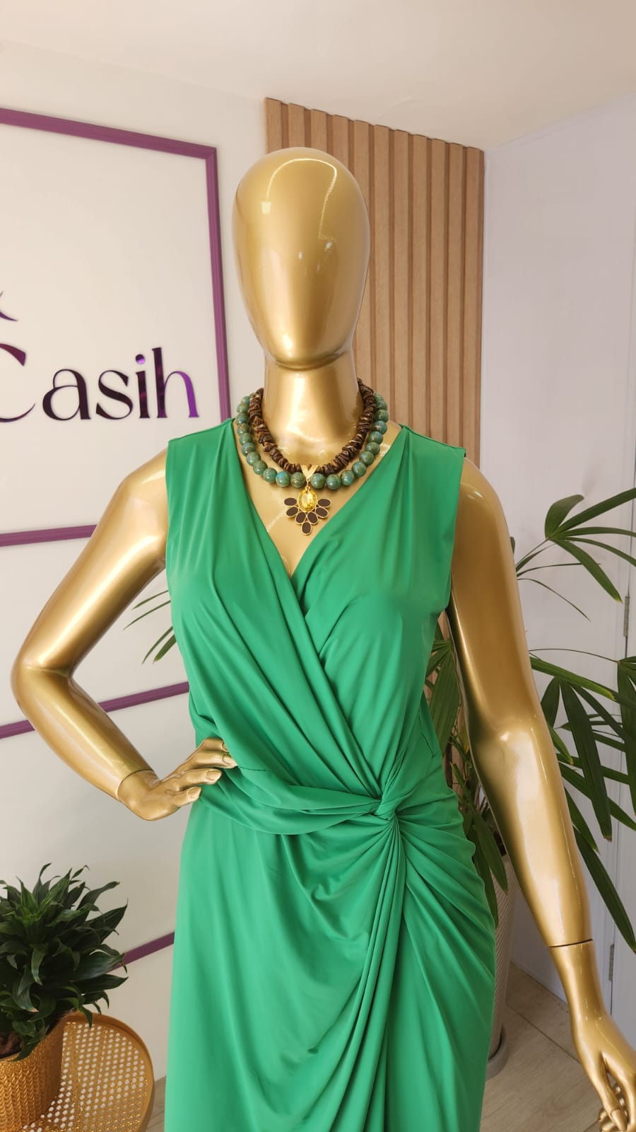 Para um toque ainda mais elegante, um colar feito artezanalmente que valoriza o decote transpassado, realçando o visual com sofisticação e charme.