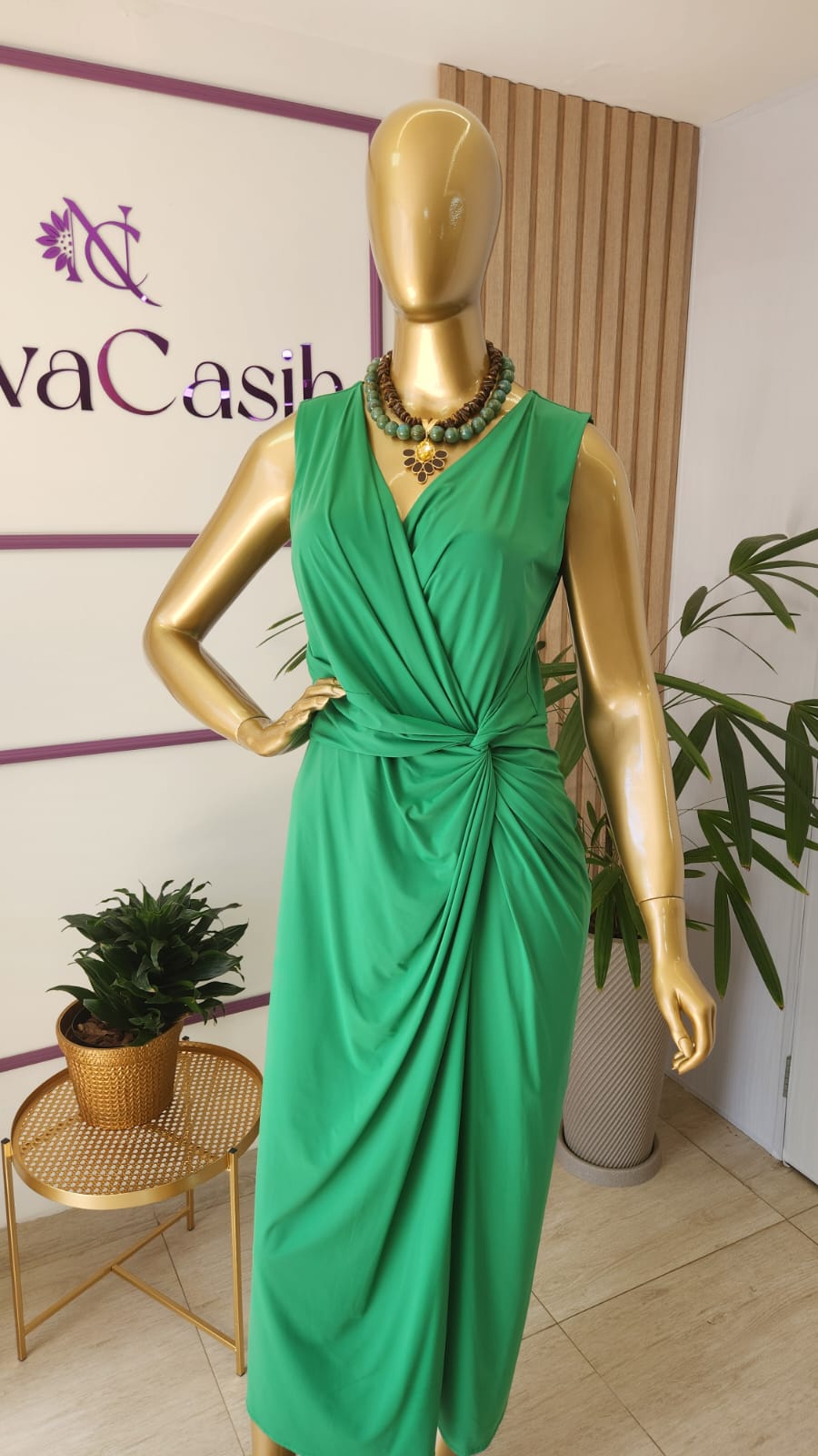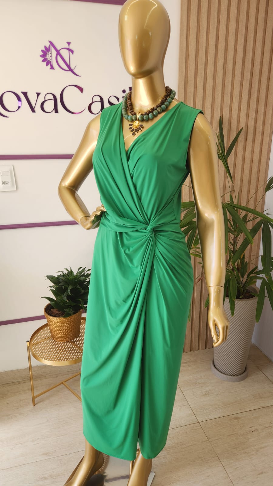 O vestido midi verde é confeccionado em tecido premium maleável Fluity, que oferece toque suave, caimento impecável e liberdade de movimento.
