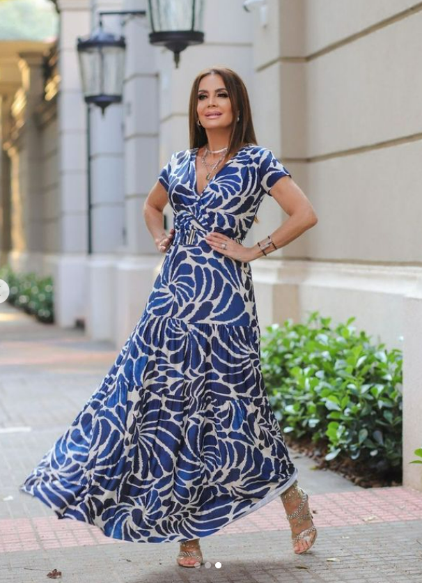 O vestido longo de manga curta Anisia de estampa exclusiva é uma peça que exala sofisticação e personalidade.