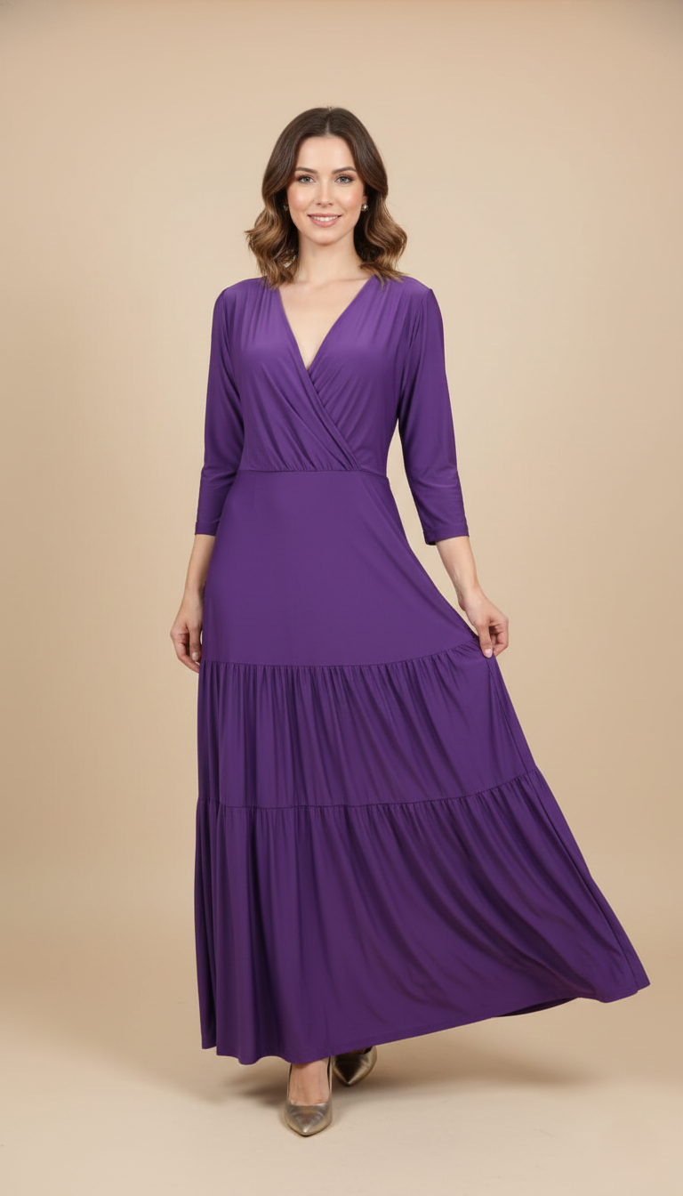 Vestido Longo Elegance Yuna Violeta: Decote Transpassado e Saia em Camadas