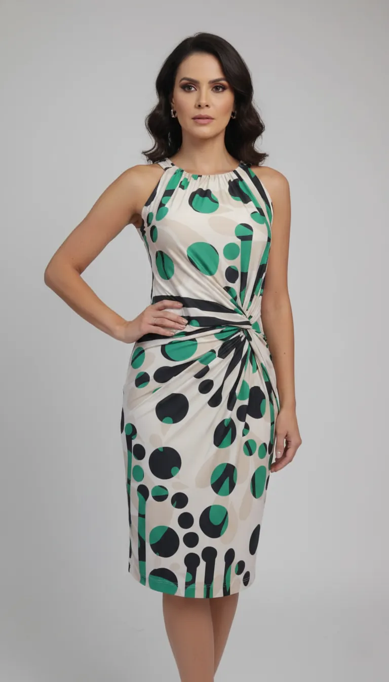 Decote e Comprimento: Apresenta decote tipo canoa/gola alta e é sem mangas, ideal para os dias quentes. O comprimento curto (na altura dos joelhos) é versátil e moderno.