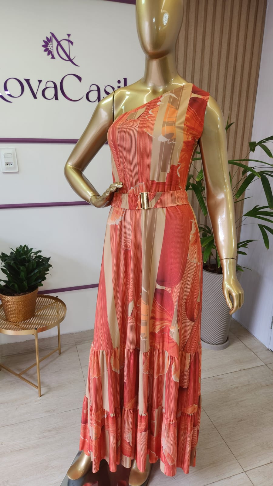 Design: O modelo apresenta um corte de comprimento longo, enquanto a saia longa em duas camadas franzidas garante fluidez e imponência suave. O grande destaque é o decote ombro único, que confere um toque moderno e valoriza o colo de forma assimétrica e elegante.