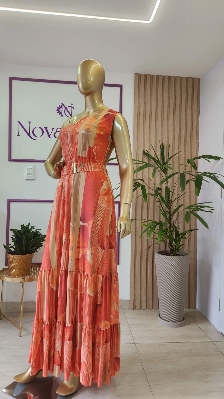 Estampa: Ostenta uma estampa exclusiva, com uma paleta calorosa que mescla tons de terracota, coral, pêssego e bege. O design da estampa, com listras verticais e elementos florais sobrepostos, cria um efeito visual alongador e altamente sofisticado.