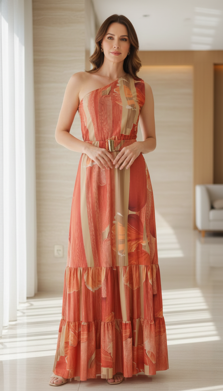 Vestido Longo Ombro Único, uma peça que personifica a feminilidade e o glamour, ideal para ocasiões que pedem um toque de sofisticação e leveza.