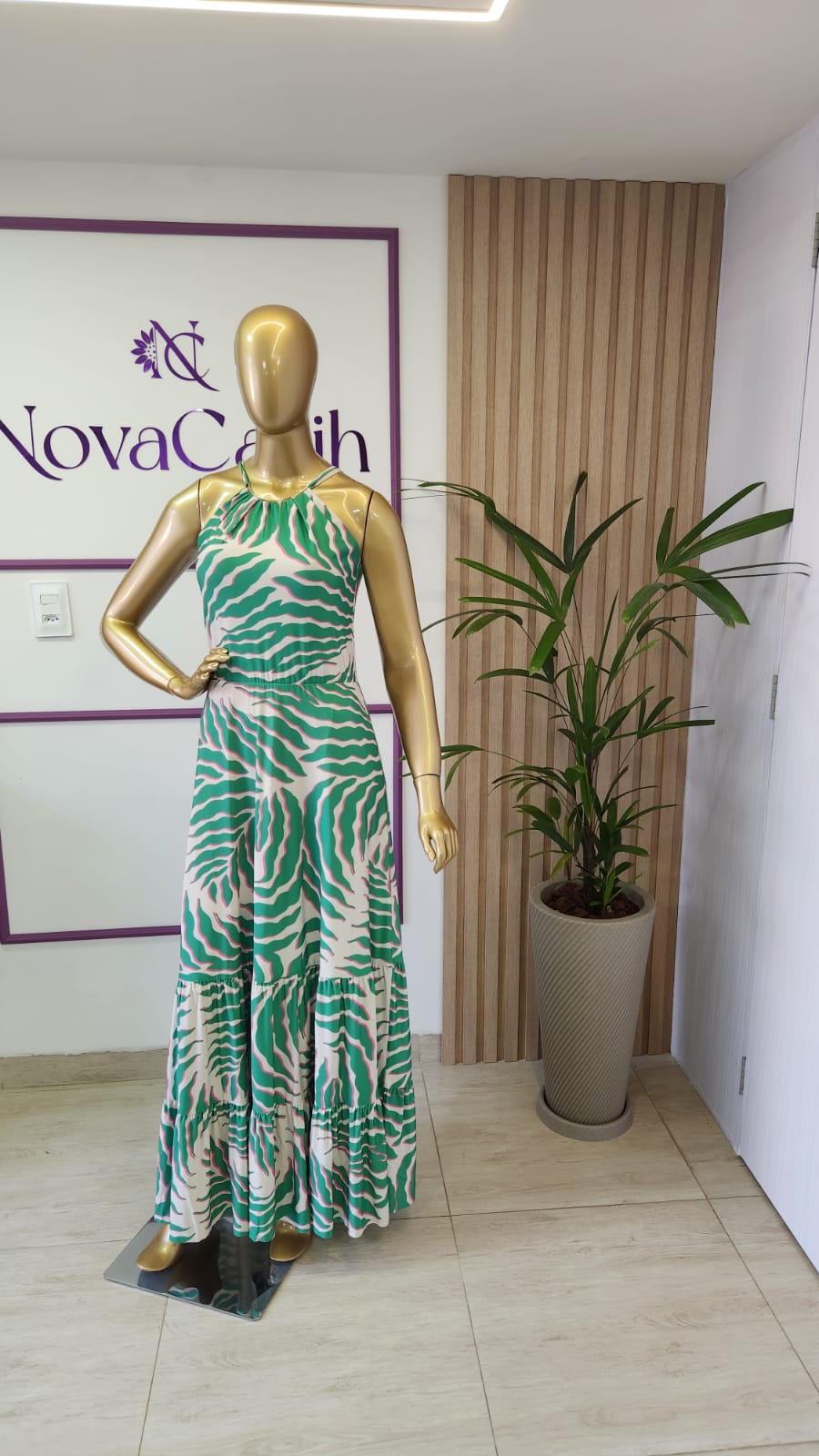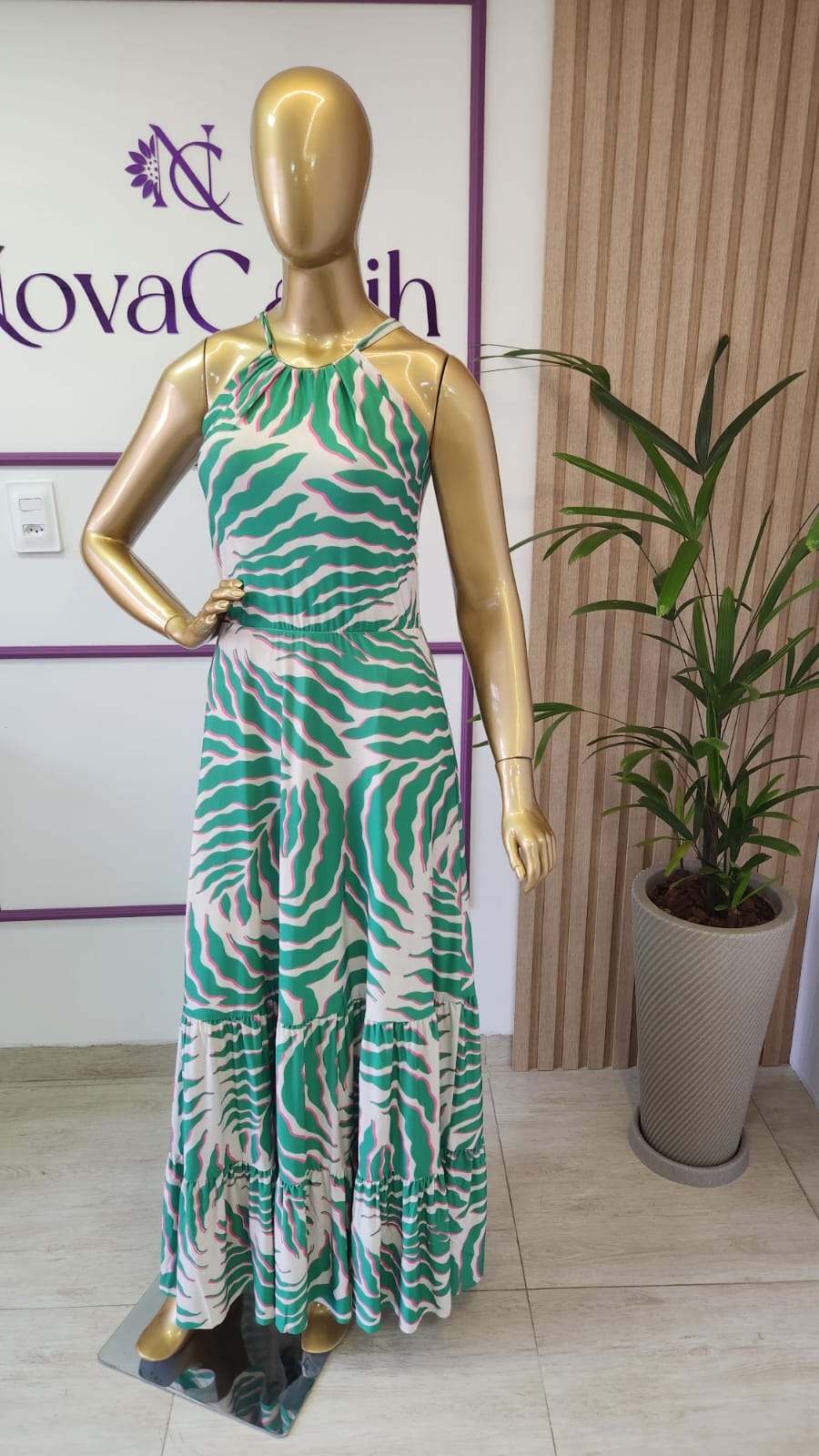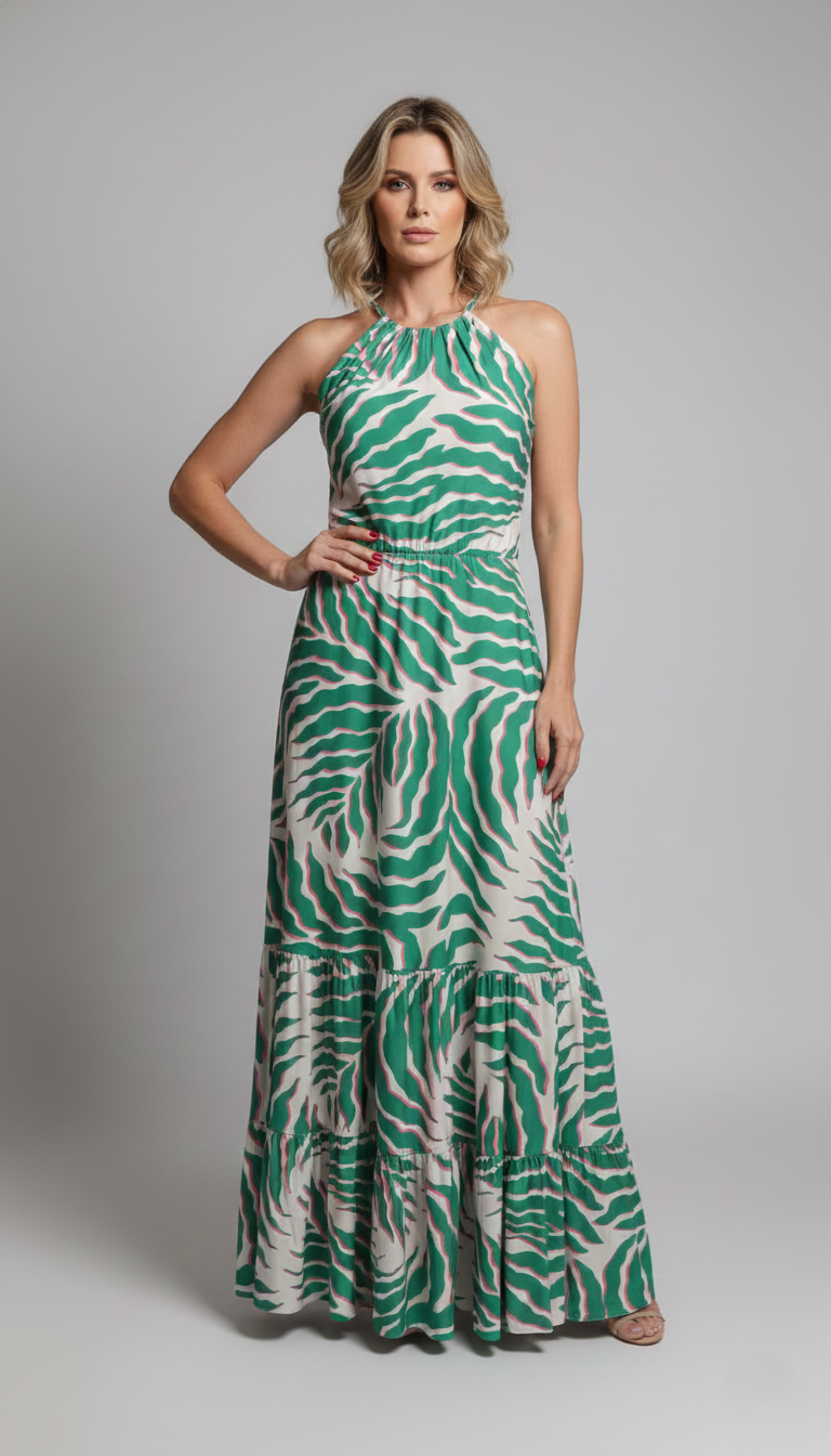 Vestido Longo Cathe Decote Halter com Metal Dourado – Estampa Exclusiva | Fluity Premium