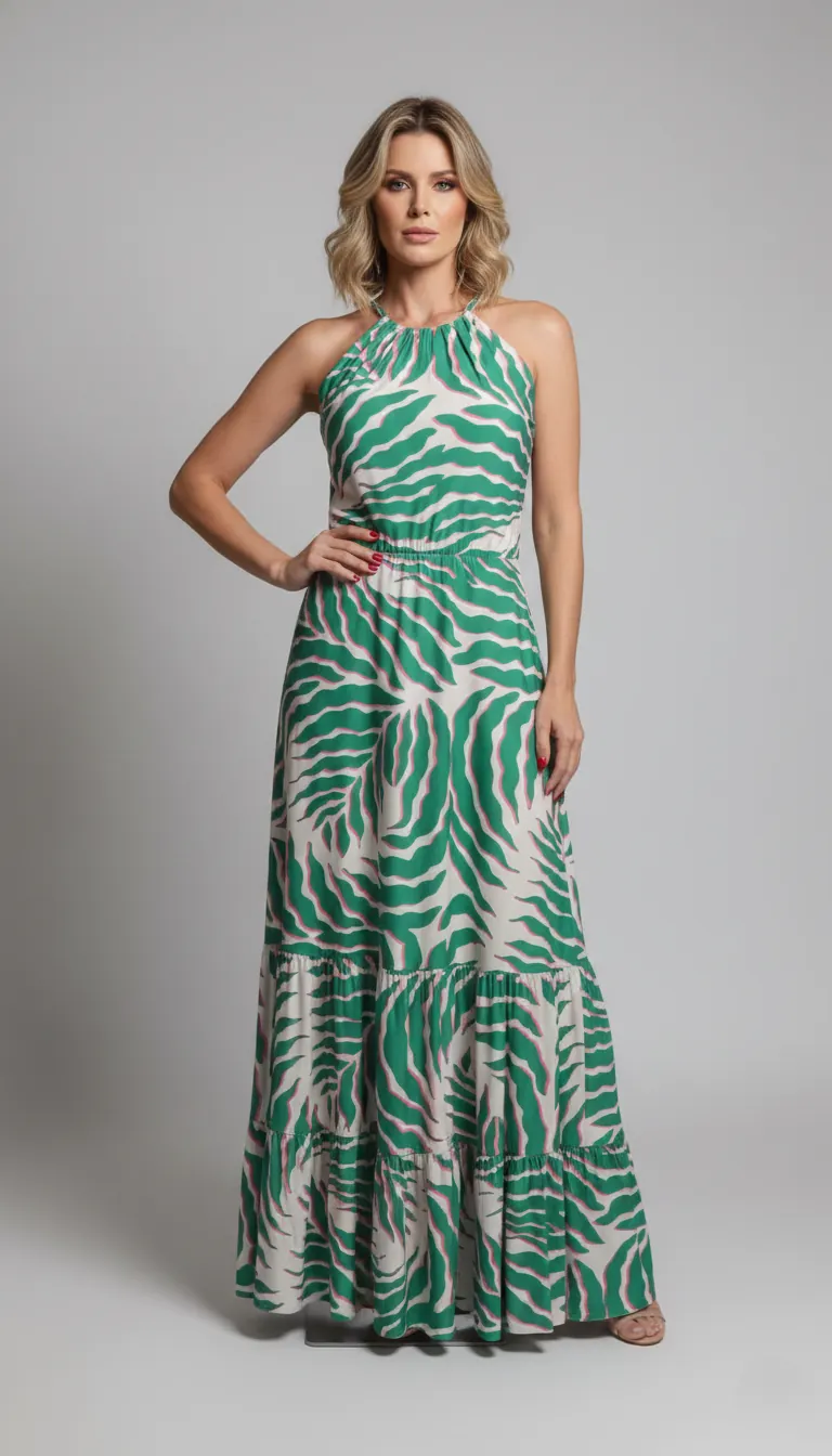 Produzido em Malha Fluity Premium, este vestido oferece caimento perfeito, toque sedoso e leve movimento, acompanhando o corpo com naturalidade e conforto. O design apresenta decote halter com aplique metálico dourado de alta qualidade, detalhe que ilumina o colo e adiciona um toque de glamour ao visual.