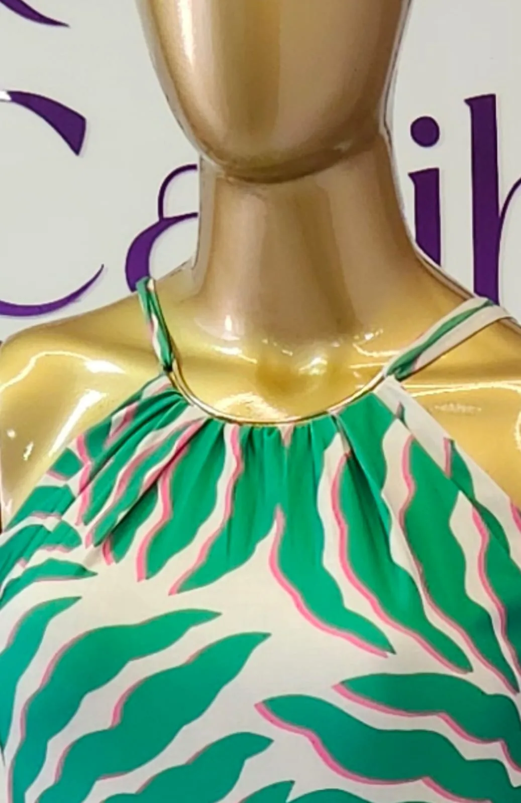Com estampa exclusiva abstrata que combina tons de verde com nuances delicadas de pink sobre fundo off white, o visual se torna moderno, autoral e cheio de personalidade.