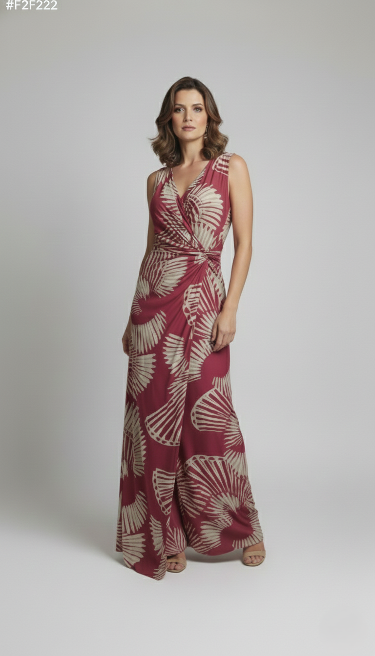 A Estampa Exclusiva é o ponto focal da peça, apresentando um padrão em tons de Vinho e Bege que remetem a elementos botânicos estilizados. Ela confere uma personalidade única e exótica, tornando o vestido uma verdadeira obra de arte.
