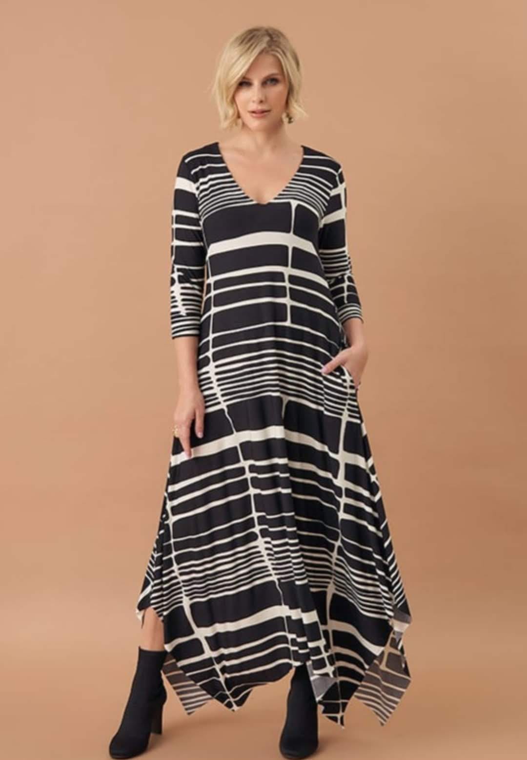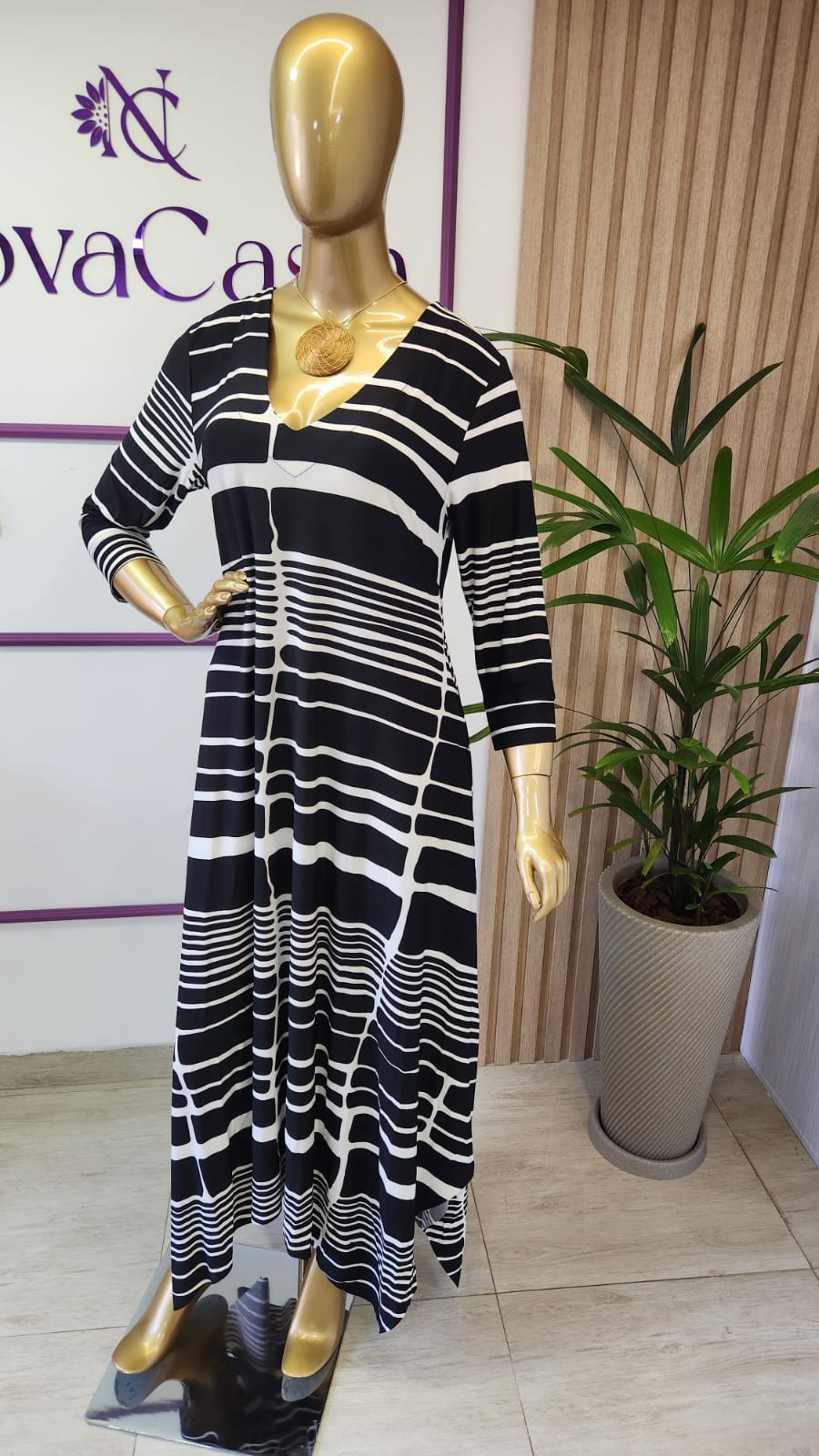 Sua estampa exclusiva em preto e branco cria um visual moderno e sofisticado, enquanto a barra assimétrica confere movimento e personalidade ao look. As mangas 3/4 completam o design com equilíbrio e versatilidade, permitindo uso em diversas ocasiões, do dia a dia chic a eventos elegantes. Possui bolso nas laterais.