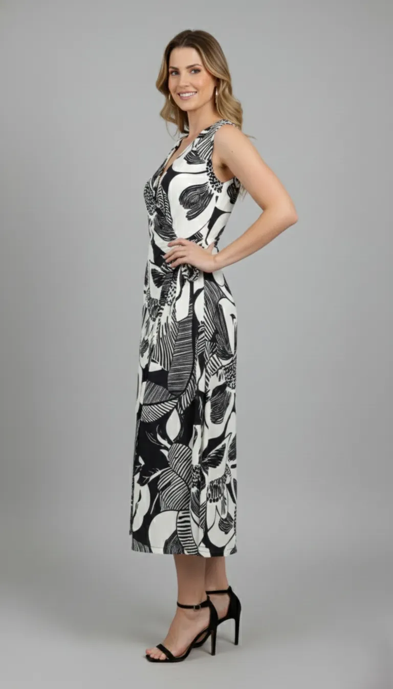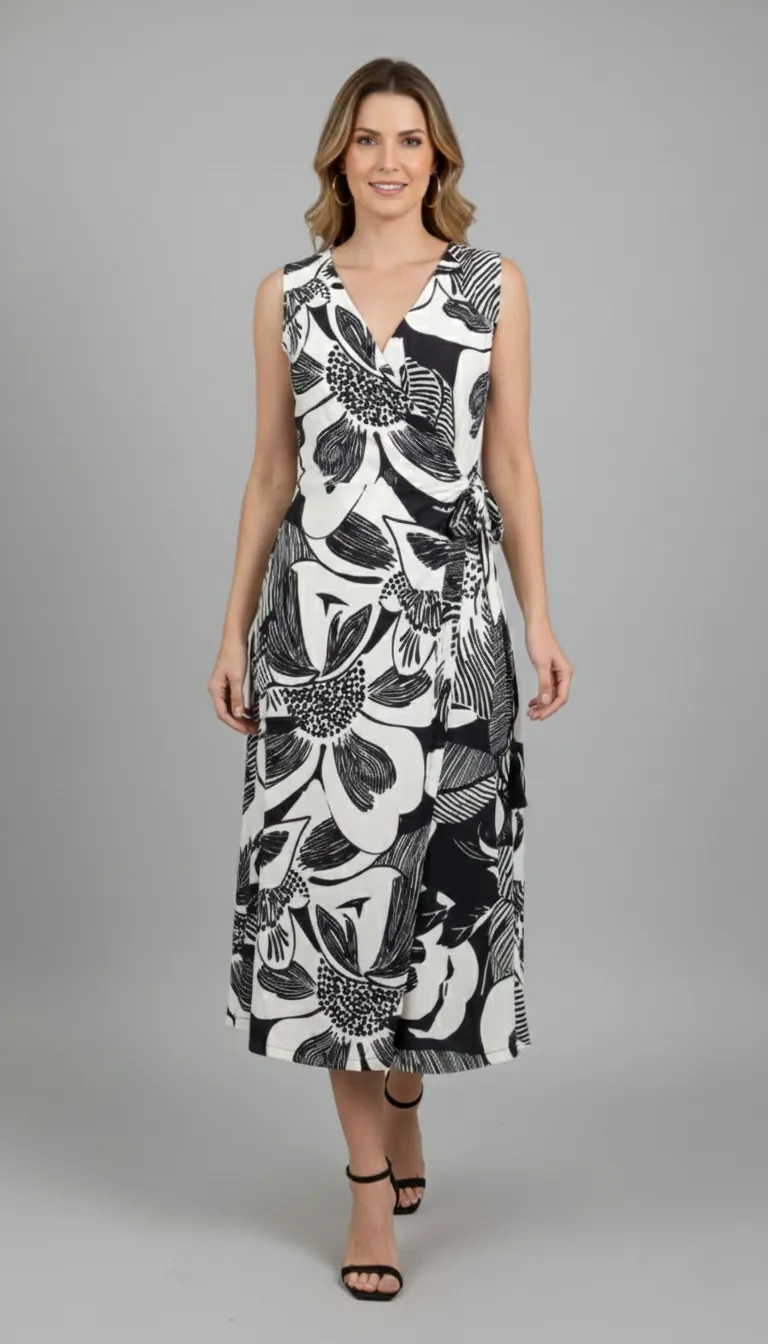 • Decote e Silhueta: O decote transpassado em “V” alonga o colo com delicadeza. O modelo regata e o corte na altura midi (abaixo do joelho) garantem um visual fresco e contemporâneo.