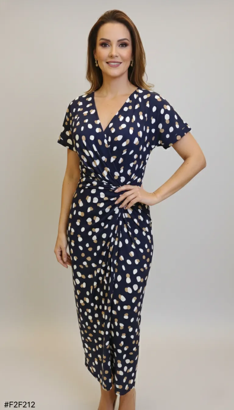 Estampa Clássica: A estampa em poá (bolinhas) estilizada em tons de Branco e Bege/Cáqui sobre o fundo Azul Marinho é um clássico atemporal que confere charme e requinte.