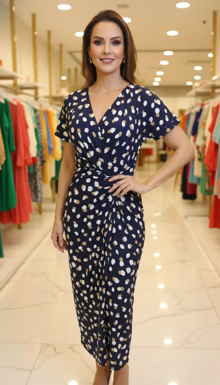 Este vestido é a definição de sofisticação versátil, ideal para a mulher que busca uma peça de alta qualidade que transita com facilidade entre compromissos de trabalho e eventos sociais.