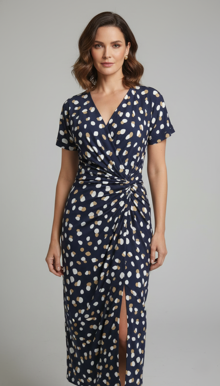 Ajuste Acinturado: O modelo é elegantemente acinturado, com um franzido estratégico na lateral que converge em um nó frontal central.