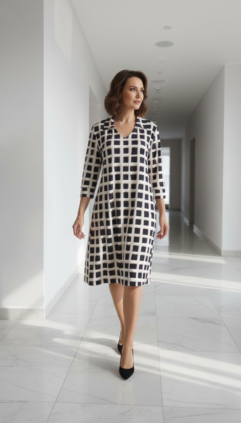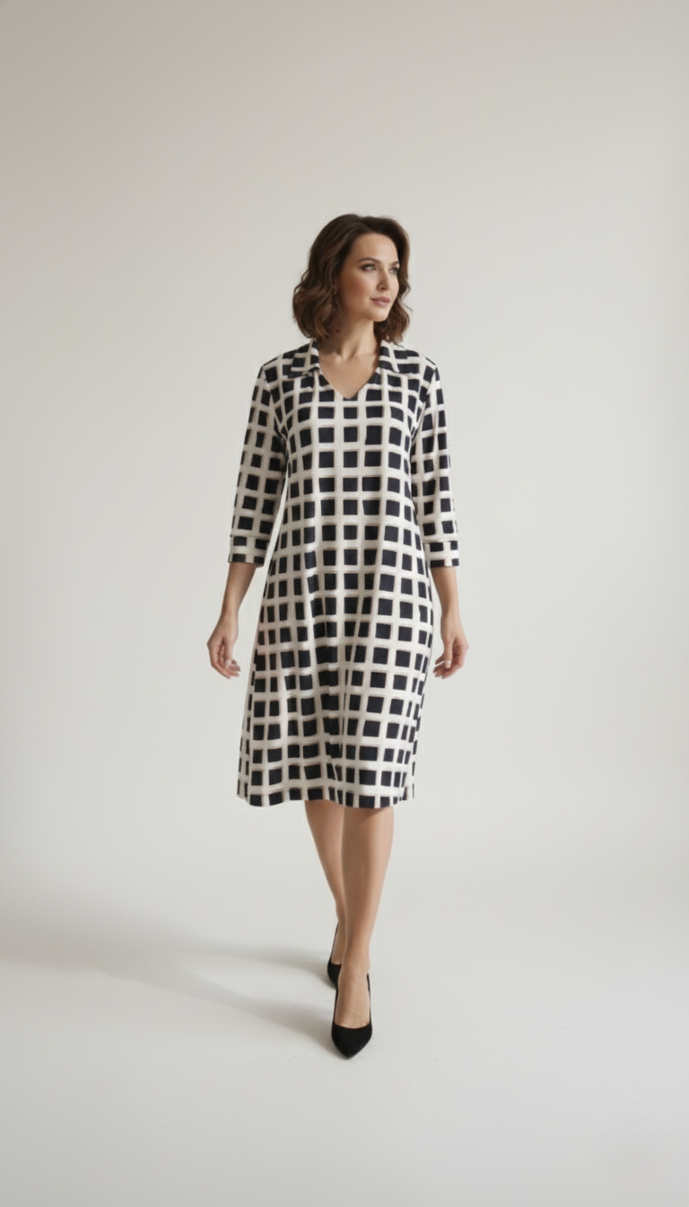 A gola de camisa adiciona um toque refinado e contemporâneo, enquanto as mangas 3/4 trazem charme e versatilidade, tornando a peça ideal para diferentes ocasiões, do trabalho a encontros casuais. Sua estampa exclusiva confere personalidade e estilo, transformando o vestido em um destaque no guarda-roupa.