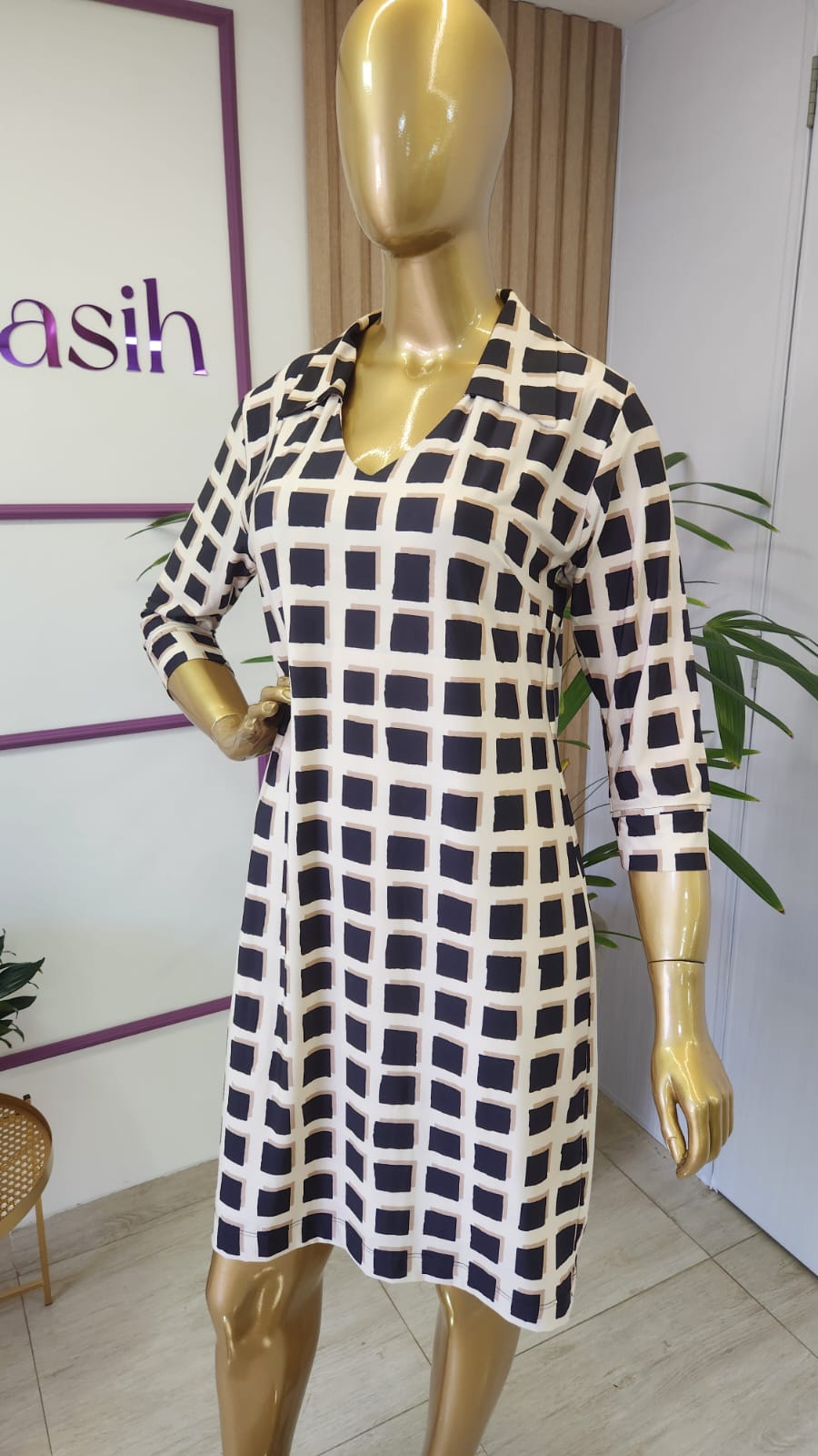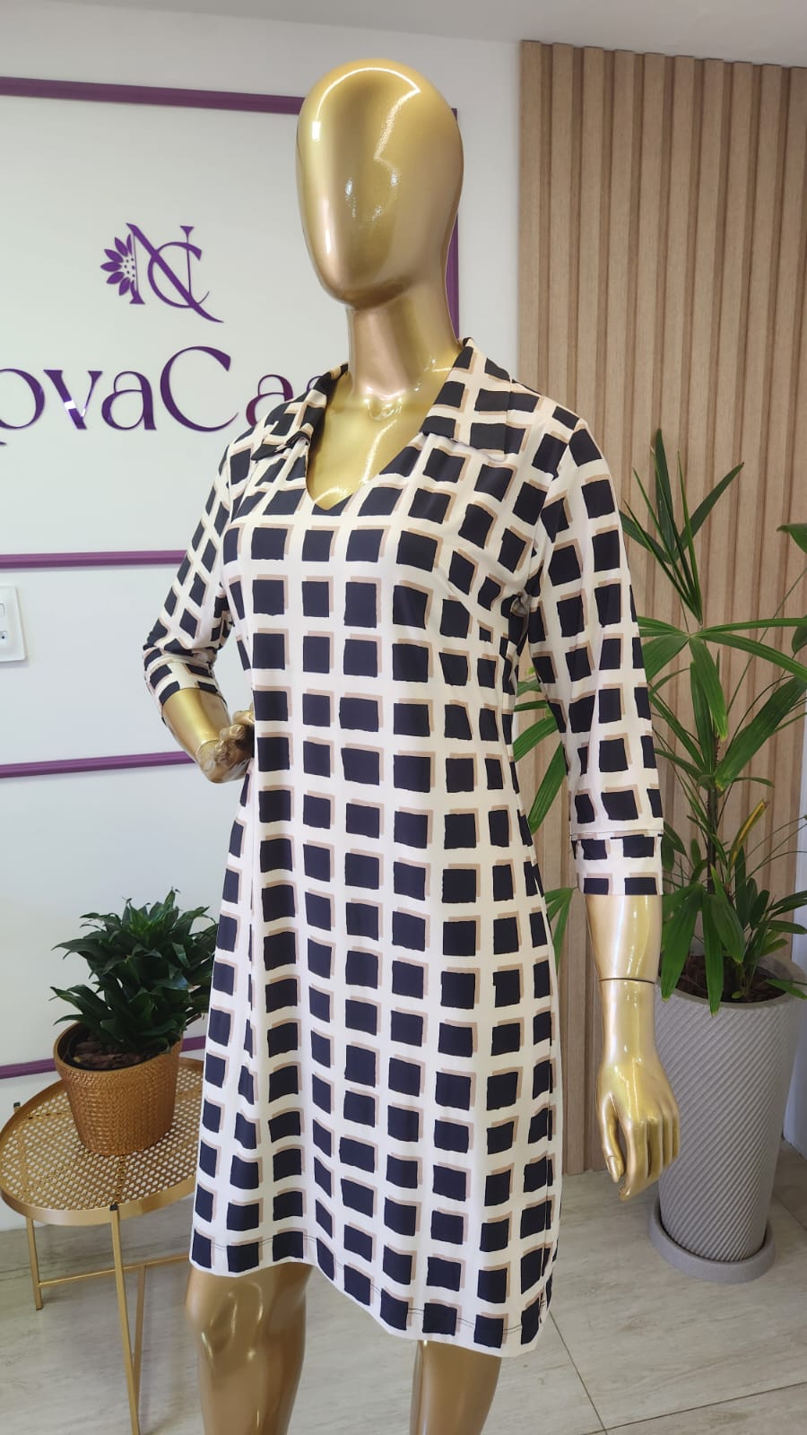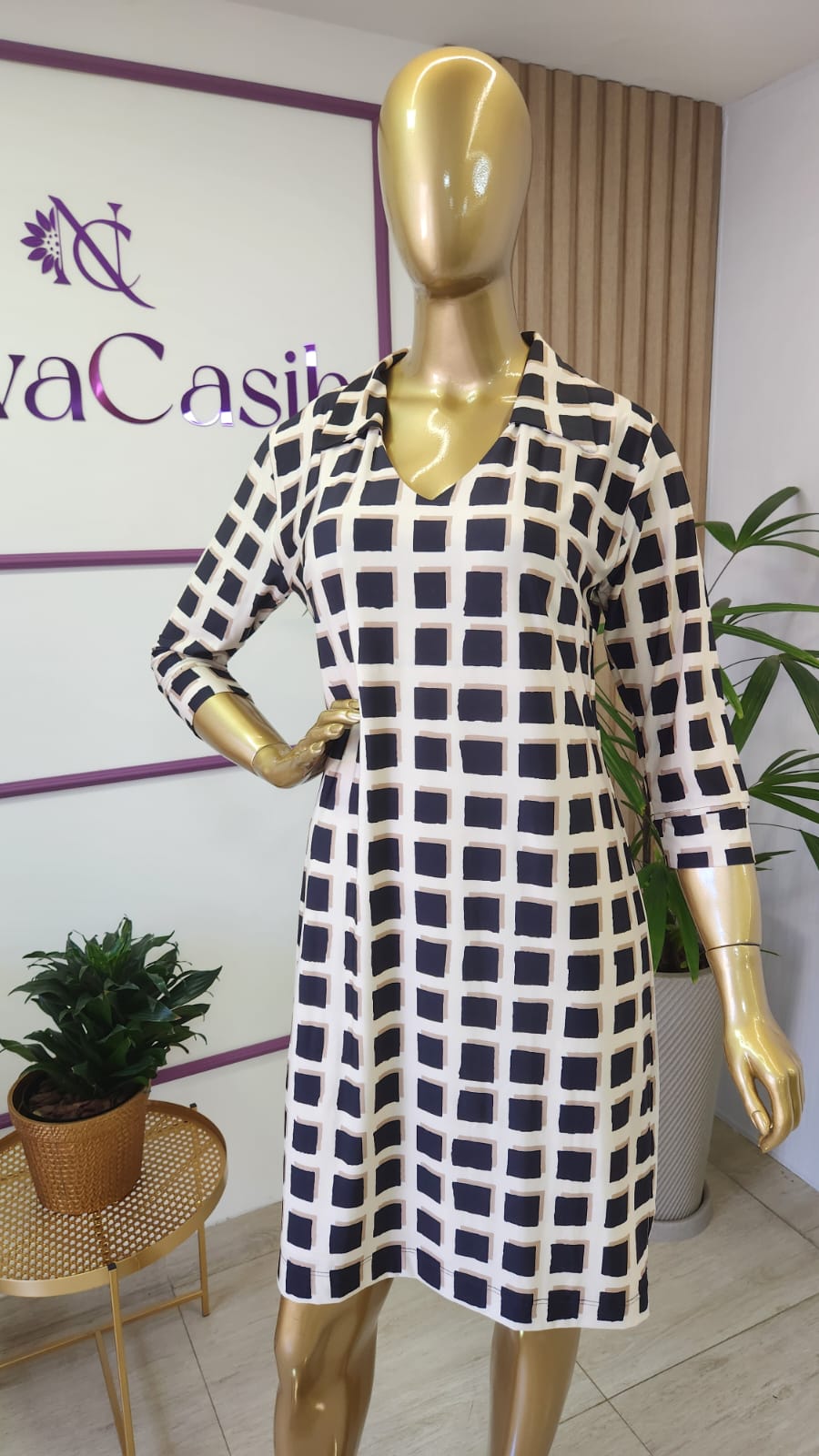 O vestido curto túnica com gola camisa e estampa exclusiva quadriculada é uma peça única no guarda-roupa feminino, combinando elegância casual com um toque de originalidade.
