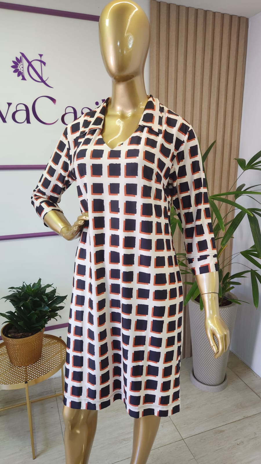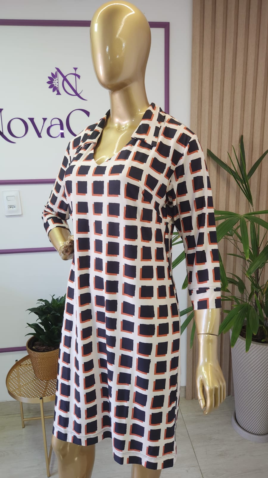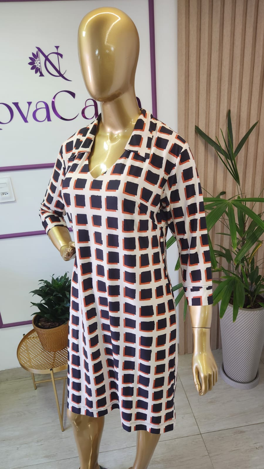 O vestido curto túnica com gola camisa e estampa exclusiva quadriculada é uma peça única no guarda-roupa feminino, combinando elegância casual com um toque de originalidade.