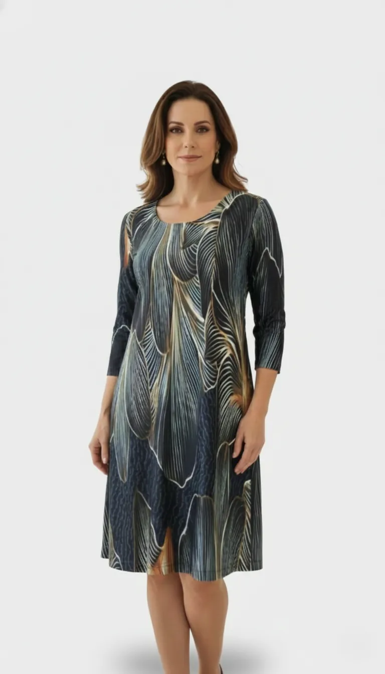 Elegância e arte se encontram neste vestido curto túnica, confeccionado em malha premium de toque macio, caimento encorpado e conforto excepcional. A modelagem fluida valoriza a silhueta com leveza, enquanto as mangas 3/4 trazem equilíbrio e sofisticação ao visual.